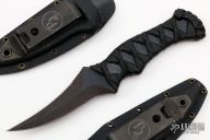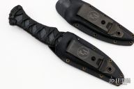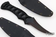 This Gadana by Tracker Dan features a black finished blade with .239" blade stock and .985" blade depth. The handle has flat cord wrap with shroom cap at the tail. Comes with two kydex sheaths.  Excellent condition.