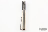 This Swayfront Persian Flipper by Brad Zinker features a Bjorkmans Twist Damasteel blade with checkered thumbrest and flipper. The handle has dovetailed Zirconium bolsters, mammoth ivory scales, anodized titanium liners with laser engraved interiors and a tip up anodized titanium clip. Rides on bearings, nice detent, lockup and blade seating. Comes with zippered case. New from maker at the 2022 USN Gathering.