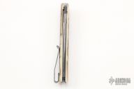 This linerlock flipper from Brad Zinker features a Nidhogg Damasteel blade with checkered thumbrest and front flipper. The handle has mammoth ivory scales, anodized titanium liners with laser engraved jeweled interiors, stonewashed and anodized tip up clip. Nice detent, lockup and blade seating, rides on bearings. Includes a padded zippered case. New from maker at the 2022 USN Gathering.