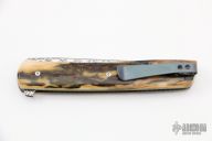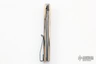 This linerlock flipper from Brad Zinker features a Nidhogg Damasteel blade with checkered thumbrest and front flipper. The handle has mammoth ivory scales, anodized titanium liners with laser engraved jeweled interiors, stonewashed and anodized tip up clip. Nice detent, lockup and blade seating, rides on bearings. Includes a padded zippered case. New from maker at the 2022 USN Gathering.