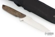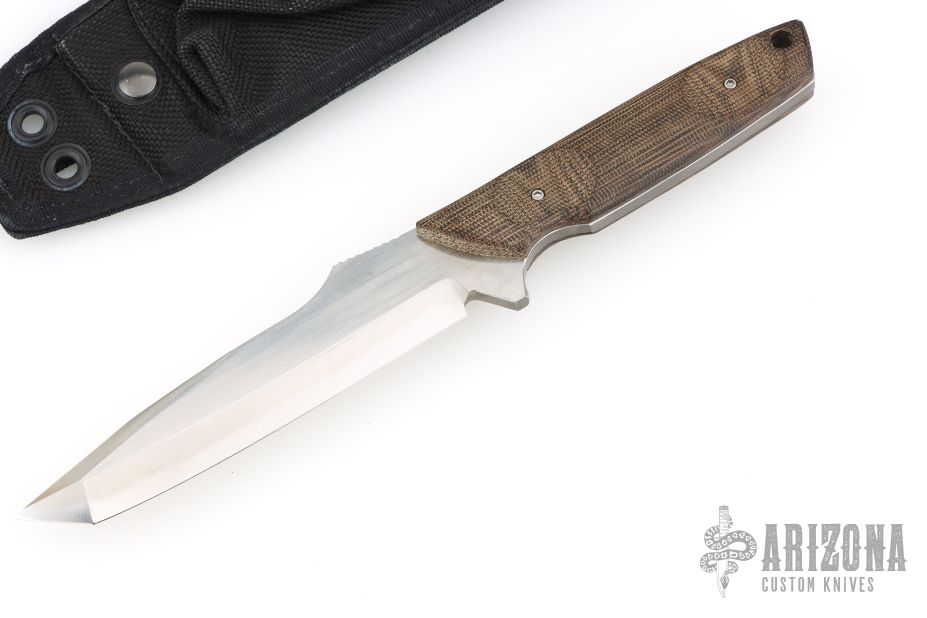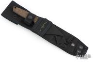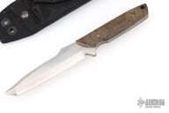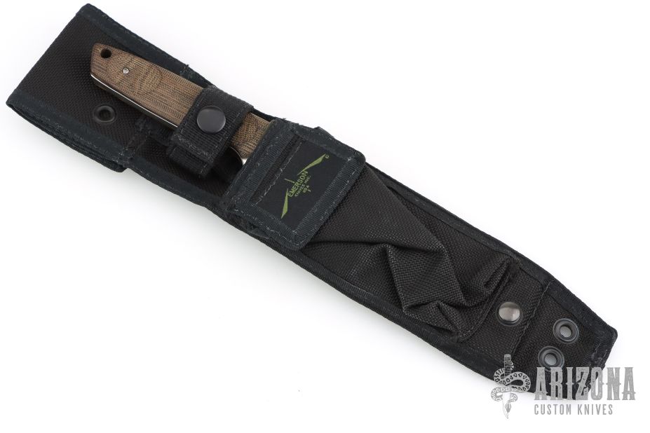 This CF-6 Phaser by Ernie Emerson features satin finished tanto chisel ground blade with false top edge and notched thumbrest, .192" blade stock and 1.215" blade depth, full tang construction. The handle has green canvas micarta scales with a lanyard hole. Comes with an Emerson black nylon over kydex sheath. Has some light scratches, otherwise excellent condition.