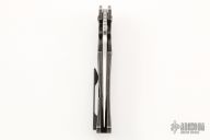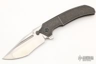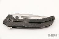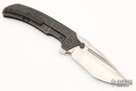 This Satori by Custom Knife Factory is a Peter Rassenti Design, the blade is satin finished with notched thumbrest and flipper. The handle has a black tumbled titanium frame with tip up black titanium clip, lanyard hole, stainless lock face insert with overtravel stop. Rides on bearings, nice detent, lockup and blade seating. Comes with nylon Velcro case and extra hardware. Excellent condition. #52 on flipper tab.