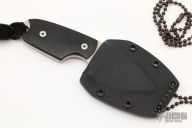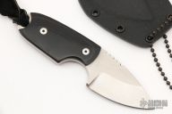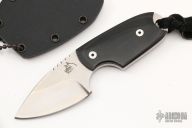 This Personal by Mike Franklin features a satin finished blade with notched thumbrest, .179" blade stock and 1.287" blade depth, full tang construction with black G-10 scales. Comes with a kydex neck sheath. Excellent condition.