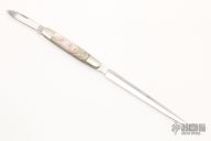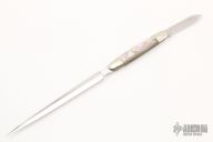 This knife by AG Russell features a mirror poslished blade with .082" blade stock and .422" blade depth. The handle has nickel silver bolsters and abalone scales with nickel silver liners. The handle has a satin finished pen blade with nail nick that is a slipjoint. Excellent condition.