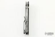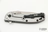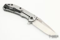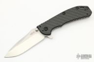 This 0566CF is a Hinderer Design executed by Zero Tolerance. It features a drop point two tone blade with swedge, notched thumb rest, dual thumb studs and flipper. The handle is comprised of a carbon fiber "A" side scale over a titanium liner and a tumbled titanium lockside. Lanyard hole in pommel. The black coated, stainless steel deep carry clip is reversible for right or left hand, tip up or tip down carry. Excellent condition. Comes with original box and papers. #0534
