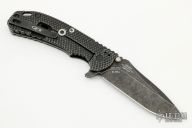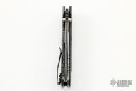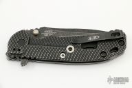 This 0560BW Framelock Flipper (#1751) has a blackwashed Elmax drop/ spear point blade with dual thumb studs and notched thumb rest. Handle is 3-D machined black G10 over stainless steel single liner, and 3-D machined blackwashed titanium (lock side). Black stainless steel 4-way reversible clip. Lanyard hole at butt. Has some black grip tape added to the front scale, otherwise excellent condition. Comes with original box and papers.