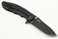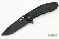 This Hinderer Designed 0562 Framelock Flipper has a black blade with swedge, notched thumbrest, dual thumb studs and flipper. Handle is black G10 and black titanium - with stainless steel lockbar insert and lockbar stabililzer. Black stainless steel clip is tip up. Dead center blade seating, flips like a champ, and has rock solid lockup. Has black grip tap added to the front scale. Has some scuffs and scratches, otherwise good condition. Comes with original box and paperwork. #0410