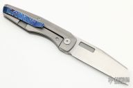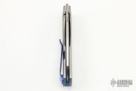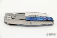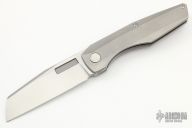 This Axon First Run Folder by Vero Engineering features a satin finished blade with notched thumbrest and thumbhole. The handle has a bead blasted titanium frame with stainless steel lockface incert, tip up timascus clip with hidden screws, timascus backspacer. Rides on bearings, nice detent, lockup and blade seating. Comes with zippered case, original clip and backspacer, and COA #701. Second Run. Excellent condition.