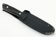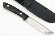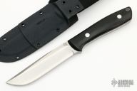 This KS-7 Wilderness by Dozier Knives has a satin finished blade with full tang construction, .199" blade stock, 1.115" depth, full tang construction. Handle has black linen micarta scales, aluminum pins and lanyard tube pin. Comes with kydex sheath. Has been resharpened, has some light scratches, otherwise good condition.