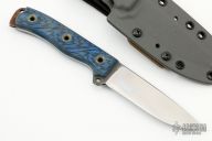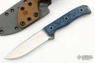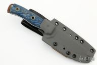 This No Choil Mean Street by Busse Combat Knife Company is 1 of 5. It has a drop point satin finished blade with a full tang construction, .148" Blade Stock 1.170" Blade Depth. This piece has black/ blue G-10 scales on the handle with a lanyard hole towards the butt of the knife. Has some light scratches and some rust on the butt, otherwise good condition. Comes with a custom kydex sheath by A. Zwelke.