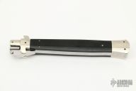 This Auto by Burn Knives features a mirror polished bayonet blade with false top edge. The handle has nickel silver bolsters, front and rear, buffalo horn scales, stainless steel liners and backspacer. Fulcrum release.  Has a square push button. Perfect function. Excellent condition.