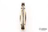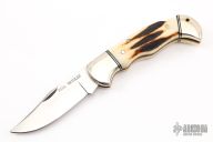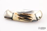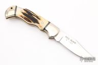 This lock back folder by Bill Wrigley features a stainless steel clip point blade with nail nick. The handle has nickel silver bolsters front and rear, brass liners, and stag inlays. Blade says "FULL BLADE #1163". Blade is not centered. Has some light scratches, otherwise excellent condition.