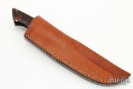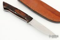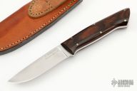 This hunter by Emil Morgan features a high satin finished blade with .132" blade stock and .896" blade depth, full tang construction. The handle has dymond wood scales. Comes with a brown leather sheath. Excellent condition.