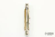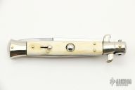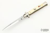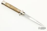 This 9" Picklock Auto made by IMCO features a polished dagger ground blade with false top edge. The handle has nickel silver bolsters, front and rear, honey horn scales, brass liners, carbon steel spring. Has a couple light scratches, otherwise excellent condition.