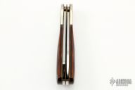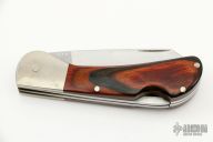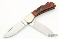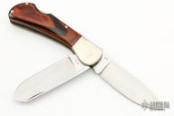 This Double Lockback by "Cox" (please let us know if you know who this maker is) featurs two satin finished blades with nail nicks. The handle has nickel silver bolsters, wood scales, brass liners, steel backspacers. #53 on the blades. Has some scratches and patina, otherwise good condition.