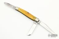 This Slipjoint by Moore Maker has 3 blades with nail nicks. The handle has nickel silver bolsters, nickel silver maker's mark stamped escutcheon, jigged bone covers with nickel silver inlay (B-side), brass liners, stainless steel springs. Has some scratches and patina, otherwise good condition. #138