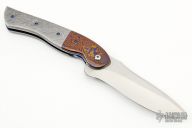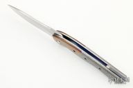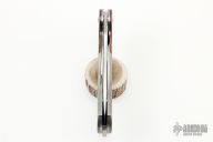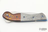 This Custom Flipper by Jim Smyth features a hand rubbed satin finished blade with notched thumbrest and flipper. The handle has timascus dovetailed bolsters, Damascus scales, notched and anodized titanium backspacer, anodized titanium screws, satin finished titanium liners with blue anodized interiors. Nice detent, lockup and blade seating. Excellent condition. Comes with a Velcro case.