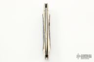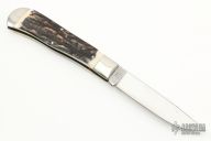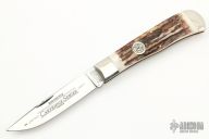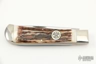 This Large Trapper by Winchester Knives features a mirror polish finished blade with nail nick. The handle has pinched sterling silver bolsters with brass liners, stag covers with a sterling escutcheon, stainless spring and spacer. Nice flush lockup and centered blade. Great condition.