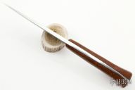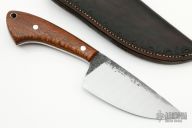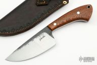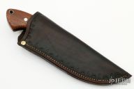 This Hunting Knife by Josh Botelho features a satin finished flat ground blade with forge finished flats, .236" blade stock and 1.922" blade depth, full tapered tang construction. The handle has Leopardwood scales with stainless steel pins. Comes with a hand tooled black leather sheath. New from maker.