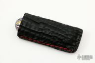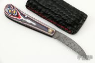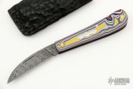 This Swayback Jack Slipjoint by Rainy Day Knives features a Chad Nichols Damascus blade and spring. The handle has Fordite covers with black G-10 liners and a stainless steel escutcheon. Has half-stop, flush in all positions. Comes with a leather slip sheath, zippered case and COA dated 8/19. Excellent condition.