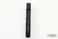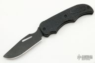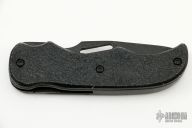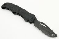 This Prototype Reverse Liner Lock folder by A. Daniel Valois features a black chisel ground blade with thumbhole. The handle has "Gator Hyde" rubber scales over black titanium liners. The pocket clip may have been the first of its kind, Valois Flush Mount Pocket Clip. This linerlock is released on the back. Some scratches on blade and frame, otherwise good condition. This is one of the last pieces from Daniel Valois's Estate.