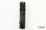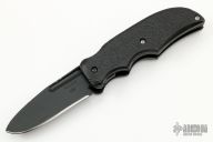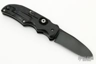 This Prototype Push Button Blade Assist folder by A. Daniel Valois features a black chisel ground blade with fullers. The handle has "Gator Hyde" rubber scales over black titanium liners, black stainless steel backspacer. Has a Valois Flush Mount Pocket Clip. When you push the button, the blade comes out just a little bit, kind of like a "California Opening" knife. Comes with a nylon belt sheath. Some scratches on blade and frame, otherwise good condition. This is one of the last pieces from Daniel Valois's Estate.