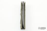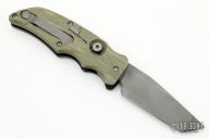 This Prototype Push Button Blade Assist folder by A. Daniel Valois features a bead blasted chisel ground blade with fuller. The handle has "Gator Hyde" rubber scales over titanium liners, steel backspacer. Has a Valois Flush Mount Pocket Clip. When you push the button, the blade comes out just a little bit, kind of like a "California Opening" knife. Some scratches on blade and frame, otherwise good condition. This is one of the last pieces from Daniel Valois's Estate.