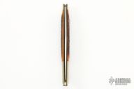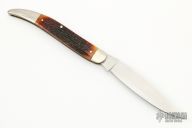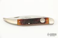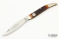 This Texas Rangers 180 Year Commemorative by AG Russell features a satin finished blade with nail nick. The handle has nickel silver bolsters, jigged bone scales with a nickel silver escutcheon, brass liners and steel spring. Has some light scratches and patina, otherwise excellent condition. Dated 2003
