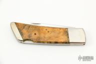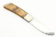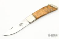 This lockback folder by Frank Lampson features a mirror polished blade with nail nick. The handle has dovetailed nickel silver double bolsters with wood scales, nickel silver liners and a stainless steel backspacer. Nice lockup and blade seating. Marked "22-1-84" on blade. Has some light patina and scratches, otherwise excellent condition.