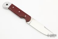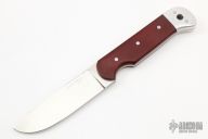 This knife by JW McFarlin featurse a satin finished blade with sharpened top edge and notched thumbrest, .135" blade stock and 1.006" blade depth, full tang construction. The handle has red linen micarta scales with aluminum rear bolsters with lanyard hole. Has some scratches, otherwise excellent condition.