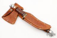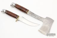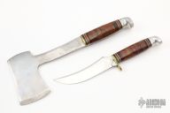 This vintage Hatchet/Hunter set by Western features an upswept blade and a hatchet. The handles have brass guards, stacked leather scales and an aluminum pommel. This is a vintage set and has been lightly used. Both hatchet and hunter has some patina and light scratches, otherwise good condition. Comes with original sheath.