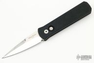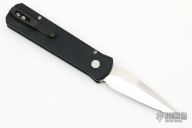 This Godson from Pro-Tech Knives features a hand ground and mirror finished blade ground by Mike Irie. The handle has a black aluminum frame with a GSD leather inlay, black stainless steel tip up clip. Comes with original box and papers. Has some light scuffs and scratches, great condition otherwise.
