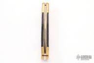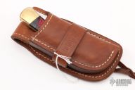 This Buck Model 110 features a satin finished clip point blade with a single nail nick. The handle has brass bolsters with integral liners and carved black pearled scales. Includes a brown leather belt sheath. Light scratches are visible on the blade and handle otherwise the knife is in good condition.