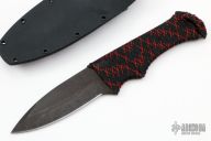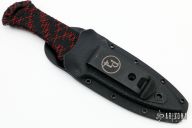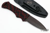 This Blood Shark by Tracker Dan features a black finished blade with non-spiral grind, .159" blade stock and .978" blade depth. The handle has flat black/red cord wrap. Comes with a kydex sheath and the knife will fit in either direction. New Condition.