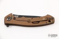 A striking difference when compared to the previous edition is the type of steel. After all, this knife is made from ZDP189 steel. A stainless type of steel that is known for its exceptional hardness and how well it retains its sharpness. Definitely a type of super steel. The standoffs between the two handles are stylishly coated in black. Just like the blade. The handle has been enhanced with a coyote-tan DLC coating. The geometric design on the presentation side of the knife looks great and offers you enough grip!
