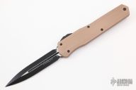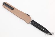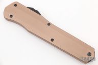 This Cypher OTF is a collaboration between Anthony Marfione and DC Monroe. It features a black double-edged blade with standard edges. The handle has a tan aluminum handle with black hardware, and a titanium tip down clip and a titanium insert at the butt. Comes with original box and papers. Excellent condition.  S/N 2093.  Dated 04/2018.