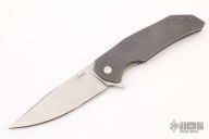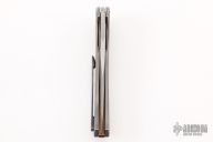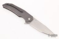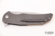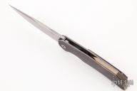 This Dragonfly Flipper by Herman Knives features a tumbled clip point blade with flipper and laser textured thumbrest. The handle has a milled an anodized titanium frame, titanium liner, and tip up titanium clip and a bronzed titanium backspacer.  Nice detent, lockup and blade seating. Rides on bearings. Excellent condition. Comes with a padded zippered case and COA.