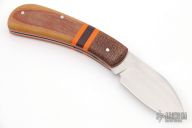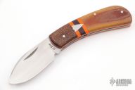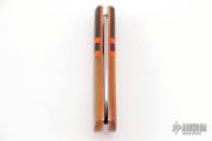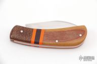 This slipjoint by Jeremy Odstahl features a hand rub satin finish blade with nailnick. The handle has burlap micarta bolsters, vintage micarta covers, orange G-10 liners and a satin stainless steel spring. Has half-stop. Excellent condition.