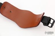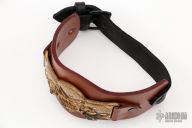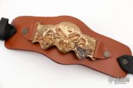 3-Alloy Mokume Gane Upper Arm Bracelet. Features three skulls. Attached to a leather arm cuff. Comes with original box and zippered case. New from maker. Approximately 8" x 2.75" not including the black strap.