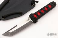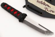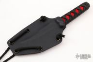 This Mini Tanto Neck Knife by Sam Eddleman features a two-tone finish tanto blade with false top edge, .14" blade stock and .794" blade depth. Handle is wrapped in a traditional Japanese style using epoxy soaked nylon cord over rayskin. Comes in a custom black kydex neck sheath. Has scuffs and scratches, great condition otherwise.