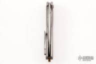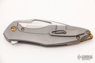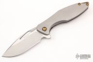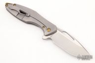 This Arius by Koenig knives features a two-tone blade with thumbhole and flipper. The handle has a nicely milled titanium frame with a titanium tip up clip, anodized titanium backspacer. Has ceramic bearings and a ceramic detent ball. Nice detent, lockup and blade seating. Comes with original box and COA September 13, 2022. Excellent condition.