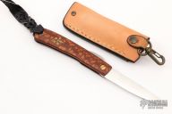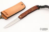 This Higonokami by Kei Goto features a VG-10 San Mai Damascus blade. The handle is one piece of Lacewood with brass and nickel silver pins, lanyard hole. Comes with a leather slip sheath. Excellent condition.