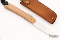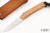 This Higonokami by Kei Goto features a VG-10 San Mai Damascus blade. The handle is one piece of Hawaiian Koa with lanyard hole. Comes with a leather slip sheath. Excellent Condition.