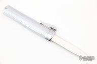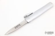 This is the Eagle Gravity knife sold in the 1980s by The Edge Knife Company. Many recall this discontinued knife and it has become almost impossible to find today. We have come across a number of these from a closed knife store, these are new old stock and are in unused condition. It is a great copy of the Anton Wingen Othello gravity knife, made in Solingen Germany. Enthusiasts have debated whether this was made in Taiwan or Japan. However, we checked with the original exporter of this knife in Japan and found that it was actually made in Seki, Japan in the 1980s. It is all metal construction with chrome finish on handle and the blade is 440 stainless and is factory sharpened. Push the lever and flick the wrist or push with blade pointing down and it slides into the open position. Point blade upward and push the button and it falls into the closed position. Excellent condition.