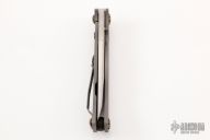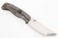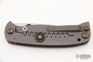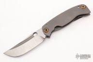 This Mini K2 framelock folder by Farid Knives features a satin finished chisel ground D3 steel blade with fuller and thumbhole. The handle has a bead blasted titanium frame with an anodized titanium clip and bronzed hardware. Nice detent, blade seating, and lockup. Has a stainless lockface insert and a titanium barrel spacer. New from maker!