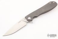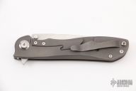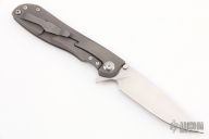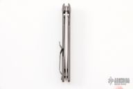 This knife features a stonewashed drop point blade and flipper tab. The handle features a bead blasted titanium frame with a matching tip up pocket clip. Light scratches are visible on the frame otherwise the knife is in good condition.