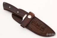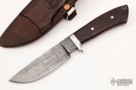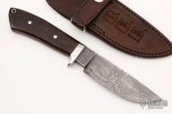 This Hunter by Journeyman Smith David Sloan features a Damascus blade with .289" blade stock and 1.259" blade depth, hidden/mortise tang construction, blade has a nice distal taper. The handle has a stainless steel guard, desert ironwood burl grip with two stainless steel pins and nickel silver lanyard hole. Comes with a Rowe's Leather brown leather sheath with locking snap. Excellent condition.