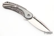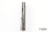 This Bodega flipper by Todd Begg Knives features a satin finished blade with a false top edge. Bead blasted titanium frame with silver twill inlays with cracked ice finish, matching titanium backspacer, tip up pocket clip and pivot collar. Includes IKBS (Ikoma-Korth Bearing System) for smooth and fast opening that requires no wrist action. Outstanding work. Comes with a zipper case. Has some scuffs on the frame, otherwise excellent condition.