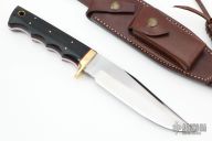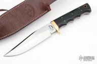 This Hunter from Ricardo Perpina features a satin finish clip point blade with a sharpened top edge and a full tang, .154" blade stock and 1.370" blade depth.  The handle has a brass guard with black paper micarta scales and red liners. Coems with a brown leather sheath with sharpening stone. New from maker.