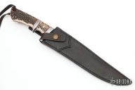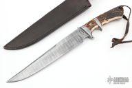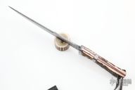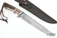 This Big Bear Sub-Hilt Fighter from Ricardo Perpina features a Damascus blade with a false top edge and a full tapered tang, .189" blade stock and 1.540" blade depth.  The handle has a Damascus guard and sub-hilt with stag scales and red liners, brass and mosaic pins. Comes with a black leather sheath. New from maker.